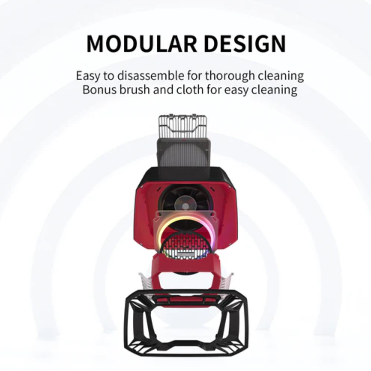 В комплекте дополнительно идёт блок питания с переходниками под разные розетки, кисточка и ткань для удаления пыли.