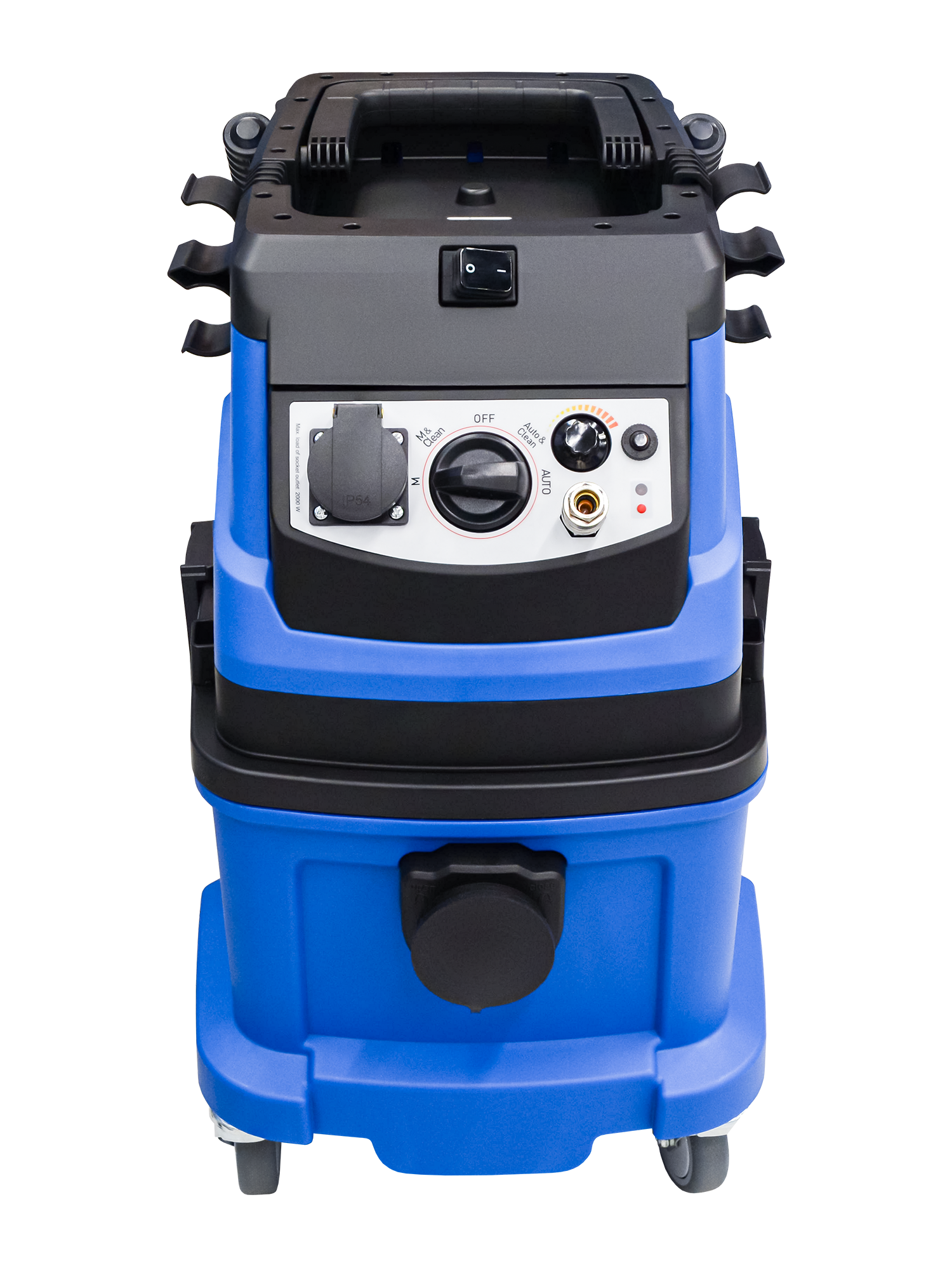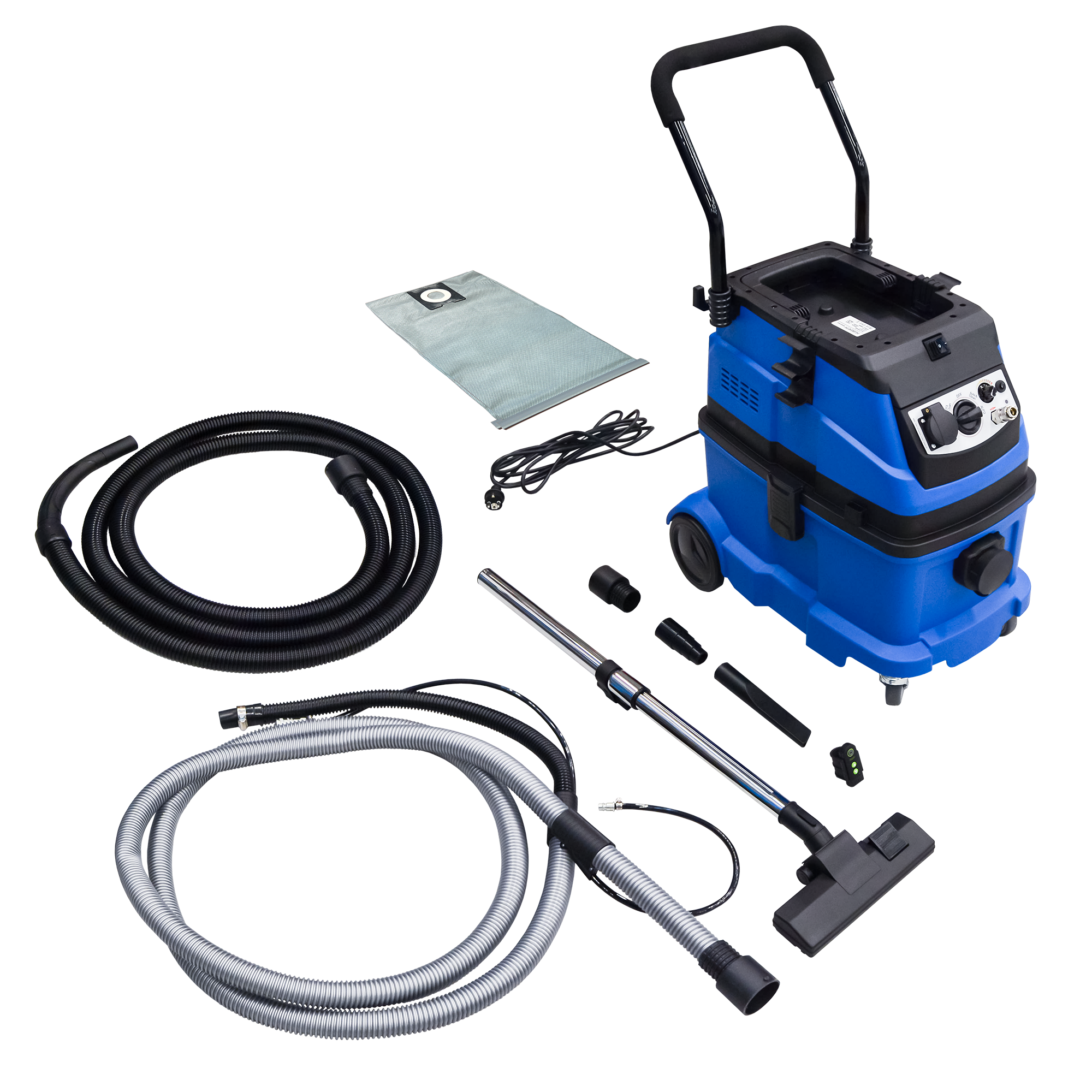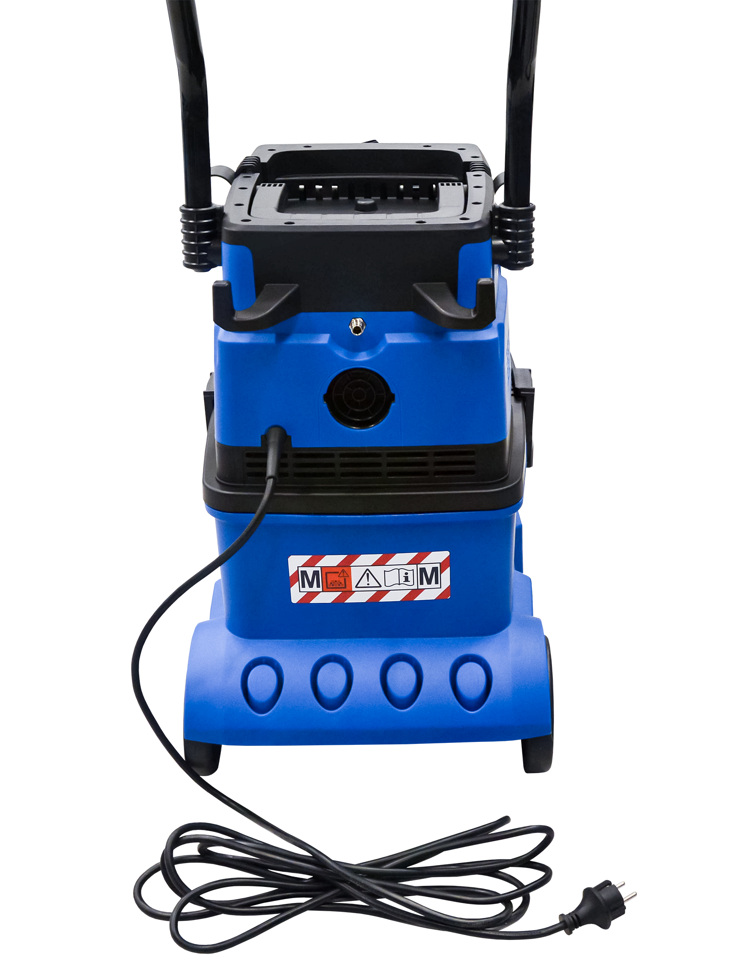 - пылесос на 4-колесном шасси (рулевые колеса с тормозными защёлками) в сборе с сетевым кабелем длиной 4.9 м, рукояткой, панелью управления и контейнером на 40 л;