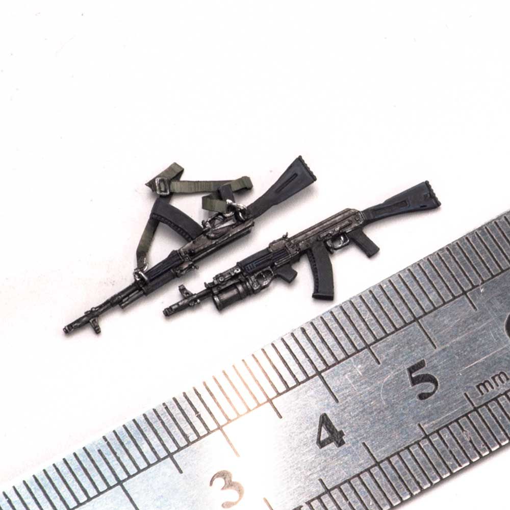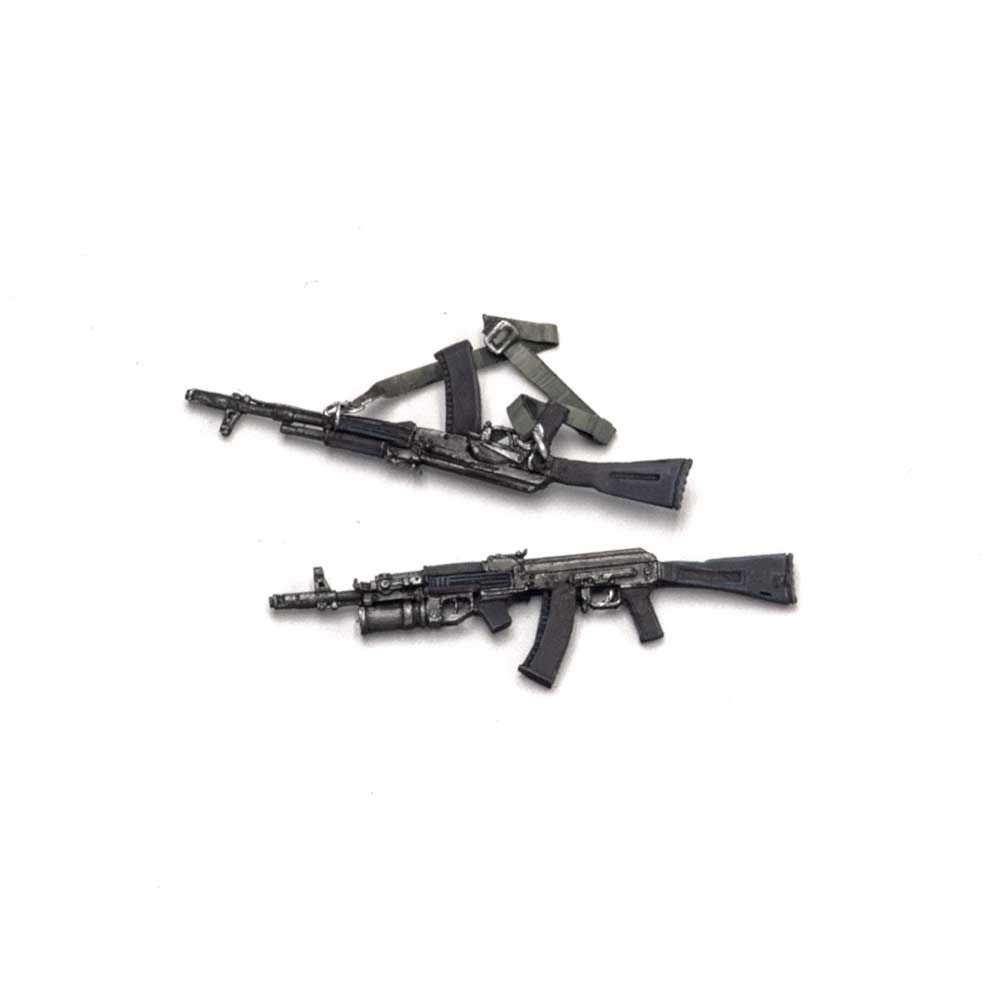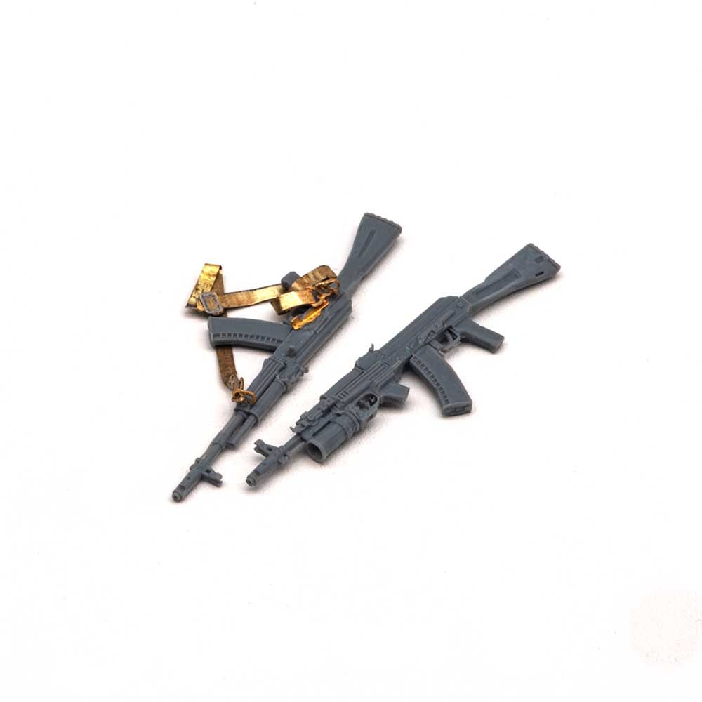 Набор включает в себя 5 выполненных из полиуретановой смолы моделей автоматов с магазинами и с двумя вариантами сборки: с подствольным гранатометом и без, а так же плату фототравления с антабками и ремнями и переводчиками огня.