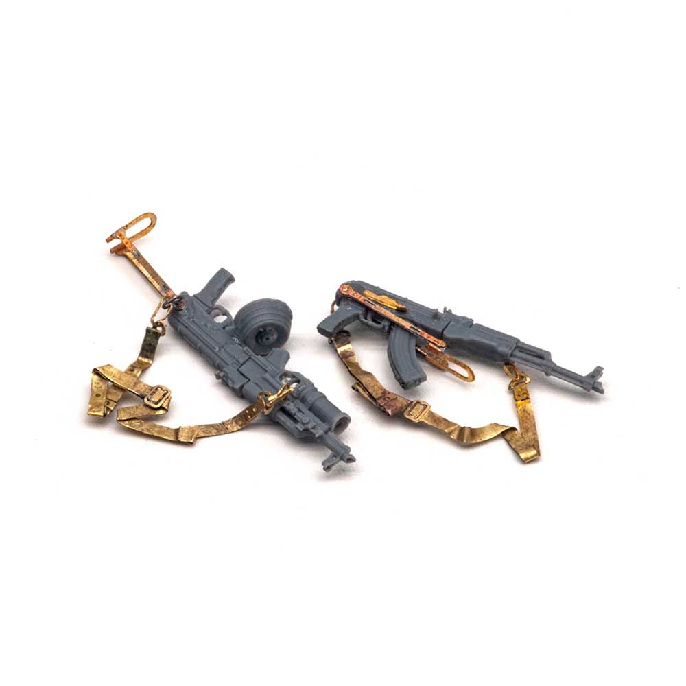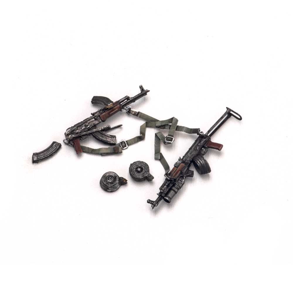 Набор включает в себя 5 выполненных из полиуретановой смолы моделей автоматов с двумя вариантами сборки: с подствольным гранатометом и без, а так же 2 типа магазинов: дисковый и коробчатый и складные приклады в разных положениях. Так в наборе присутствует плата фототравления с антабками и ремнями, прикладами и переводчиками огня.