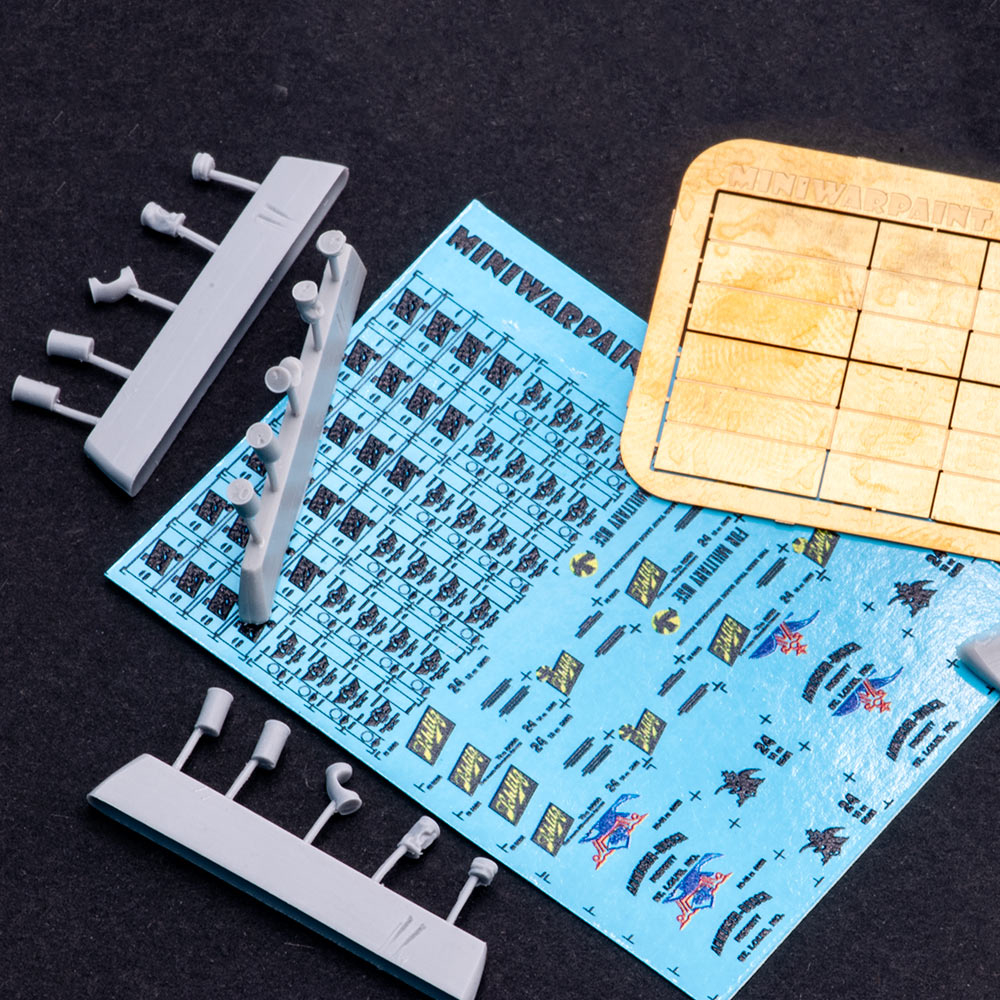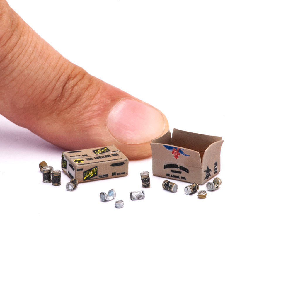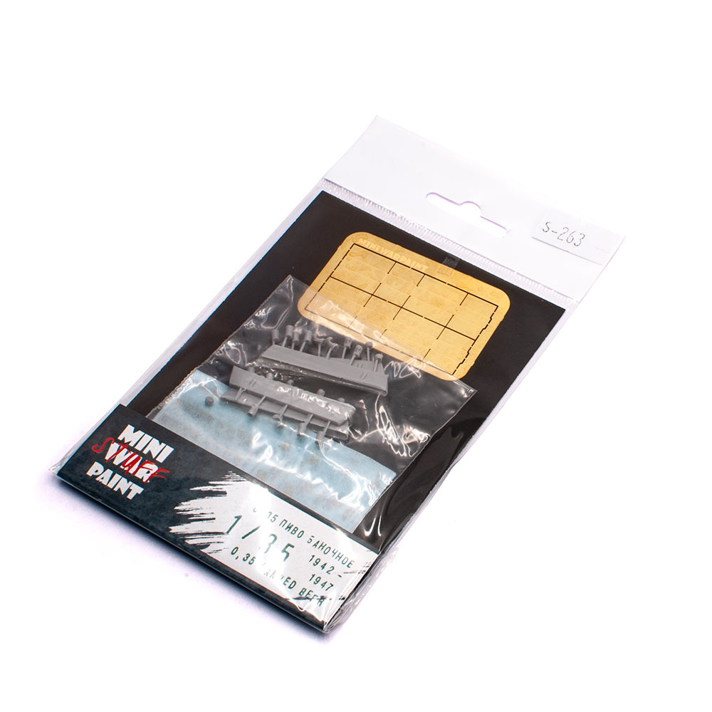 В набор, выпущенный только для масштаба 1/35, входит фототравленая плата с двумя коробками, 20 пивных банок 5и видов (закрытая, открытая и 3 вида смятых) и декали для банок и коробок на 2 марки американского пива (Schlitz и Budweiser). Банки, перед оклейкой деталей, рекомендуется окрасить в оливковый цвет. Ввиду малого радиуса и сложной геометрии мятых банок декали рекомендуется фиксировать на клей (например B7000 или ПВА)