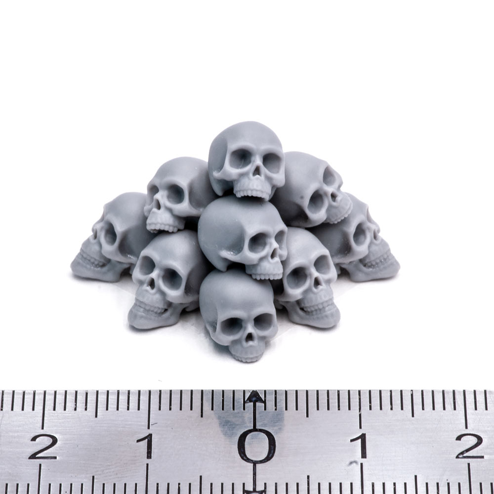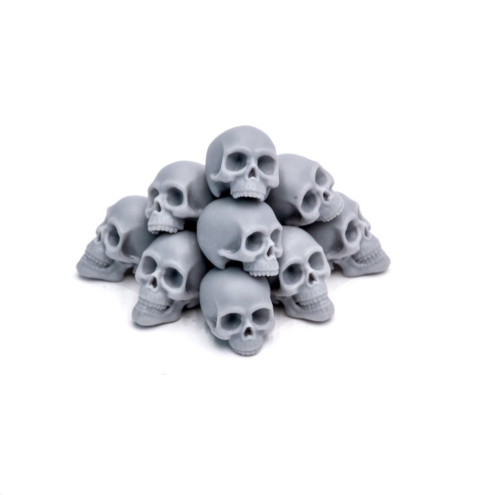 Набор из 10 полеуретановых человеческих черепов двух видов в масштабе предназначен для оформления баз миниатюр и диорам.