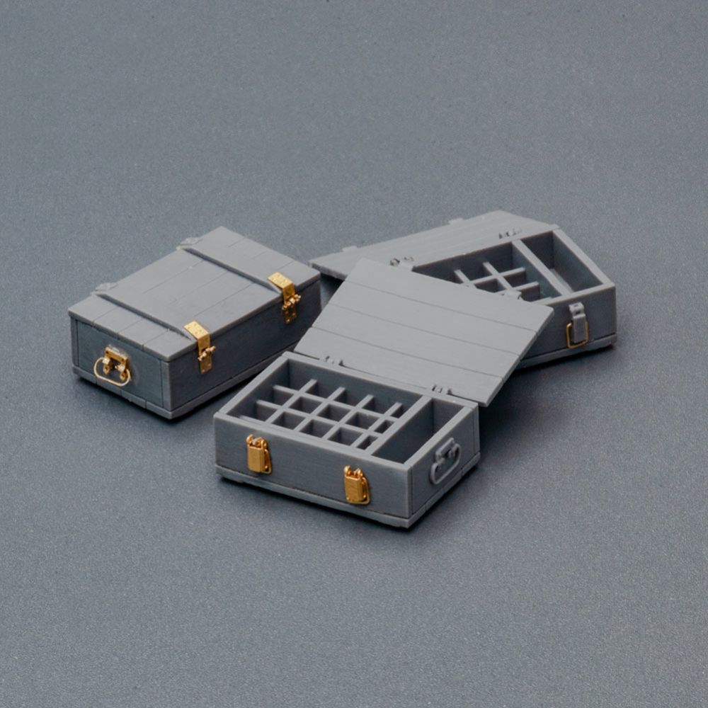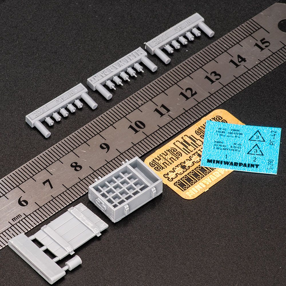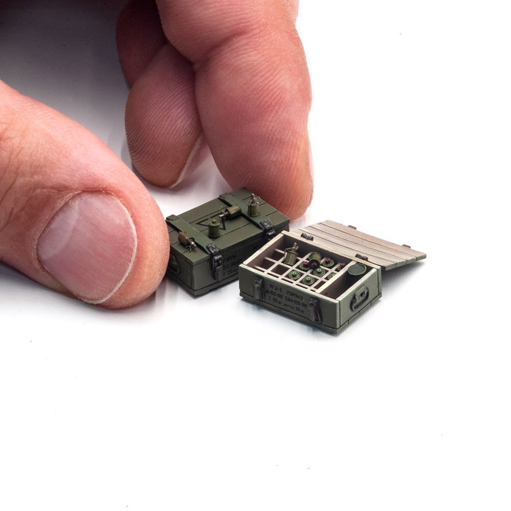 Набор включает в себя транспортировочный ящик, крышку ящика, цинк для взрывателей и 15 гранат: 5 гранат с вкрученным транспортировочным колпачком, 5 со снятым колпачком, но без взрывателей и 5 гранат с установленным взрывателем. Так же в наборе идет плата фоторавленой латуни с петлями и замками для ящика и 15 кольцами-чеками и скобами взрывателей и декаль с маркировкой ящика.