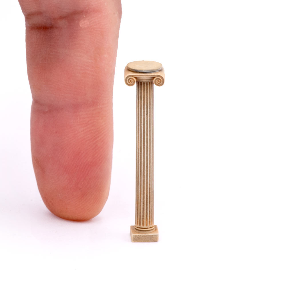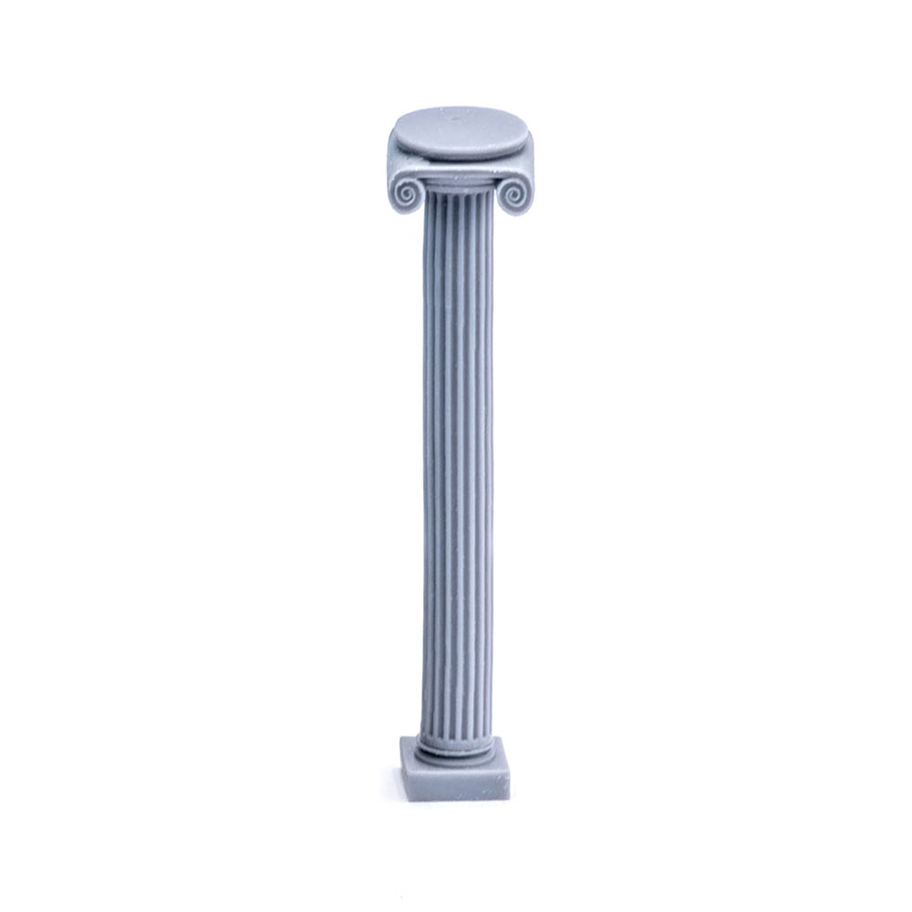 Колонна ионического ордера делится на три части: основание, ствол и капитель. База часто сама опиралась на квадратную в плане плиту — плинт. Характерной чертой ионического ордера является капитель (верхняя часть колонны), которая дополнена двумя симметрично расположенными завитками — волютами. Ствол как правило прорезан 24 или 48 вертикальными желобками – каннелюрами. Мы слегка упростили и сократили количество каннелюров до 18 в угоду внешнему виду колонны.