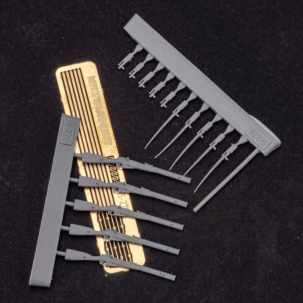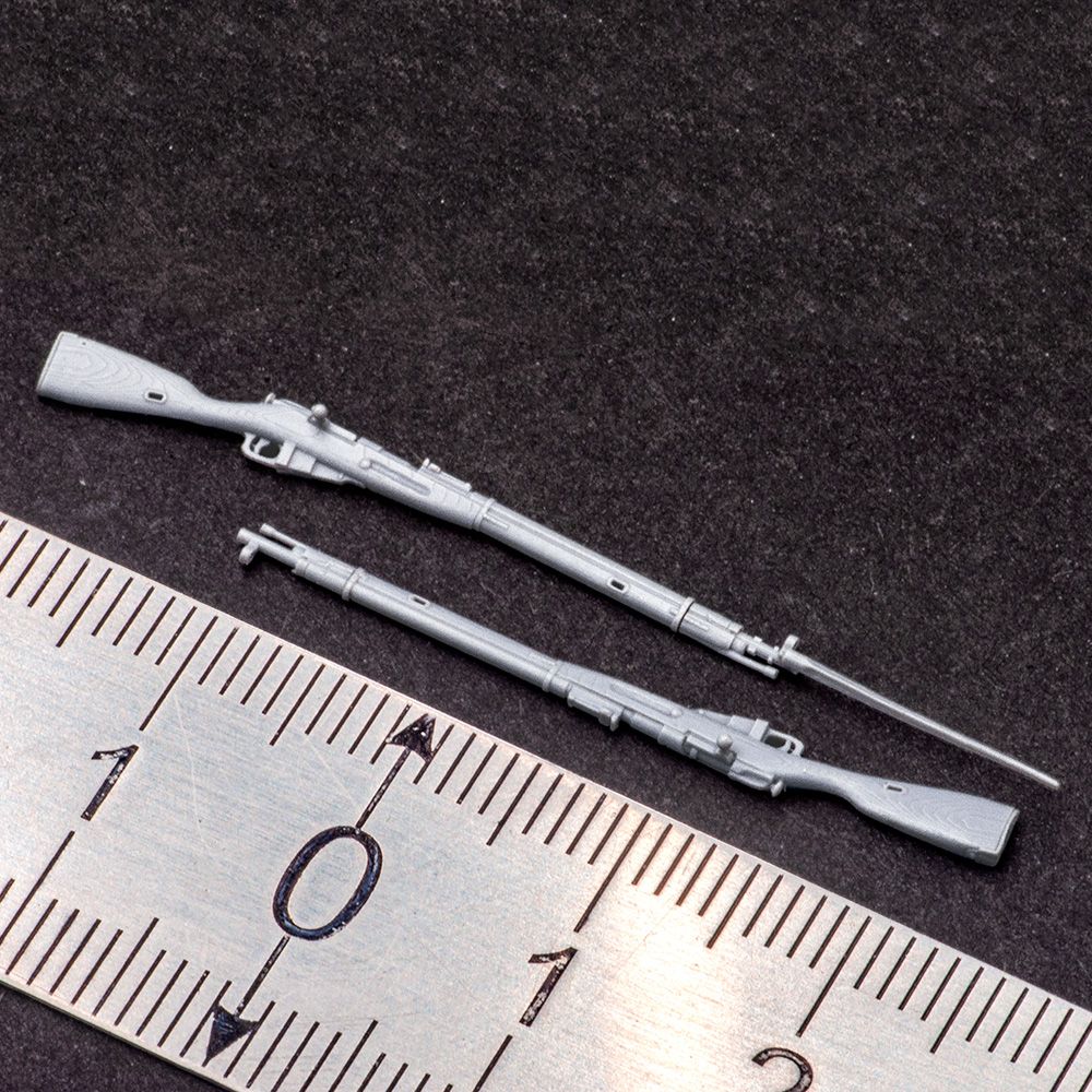 В наборе содержатся детали для сборки 5 винтовок образца 1891/1930 гг. (Индекс ГРАУ — 56-В-222) в масштабе 1/35. В наборе присутствуют детали позволяющие собрать винтовки как с примкнутым штыком, так и без него. Так же все винтовки укомплектованы фототравлеными латунными ремнями. Для сборки рекомендуется использовать суперклей (цианарилат), ултрафиолет-отверждаемый или эпоксидный клей.