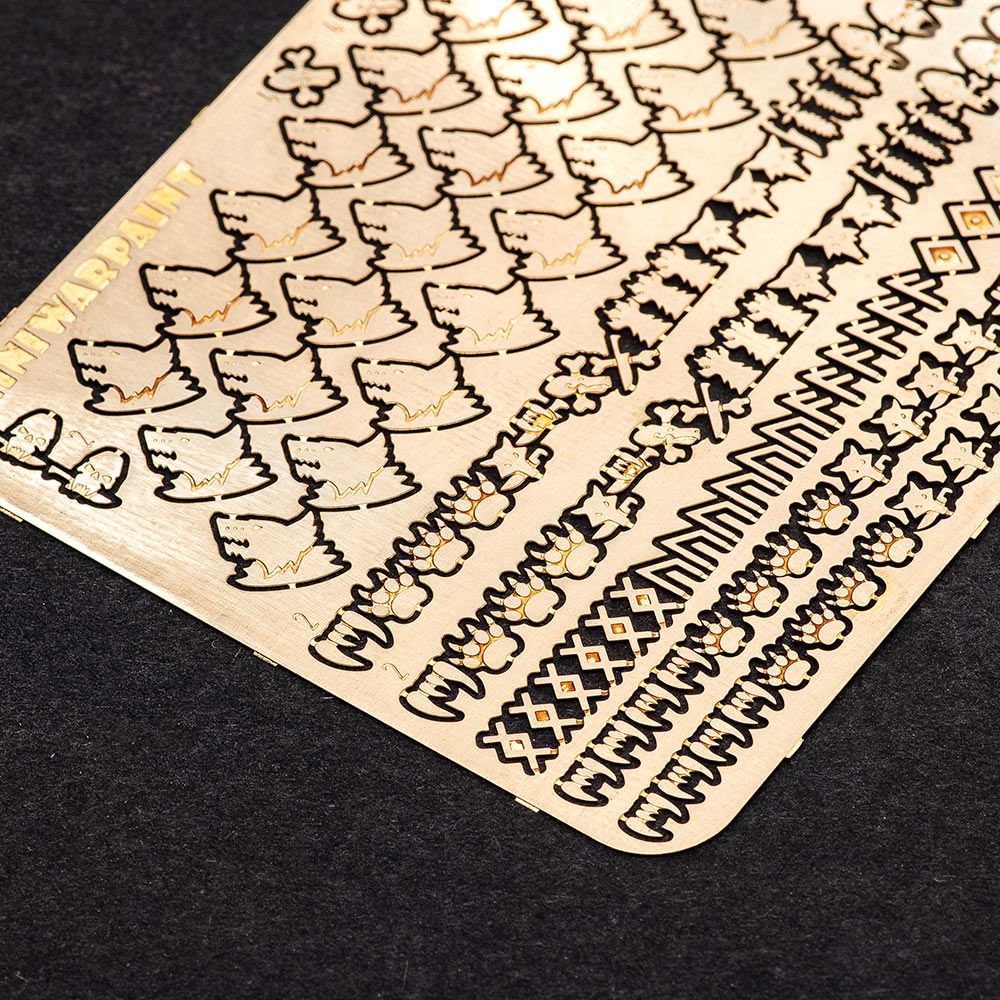 Набор фототравленых латунных дополнений для миниатюр. Набор содержит символы спейсмаринов из вселенной Warhammer40000, ордена Space Wolves, Черногривых, роты Рагнара, располагаемые на левых наплечниках, а так же символы отделений и героев, располагаемые на правых наплечниках и наколенниках.