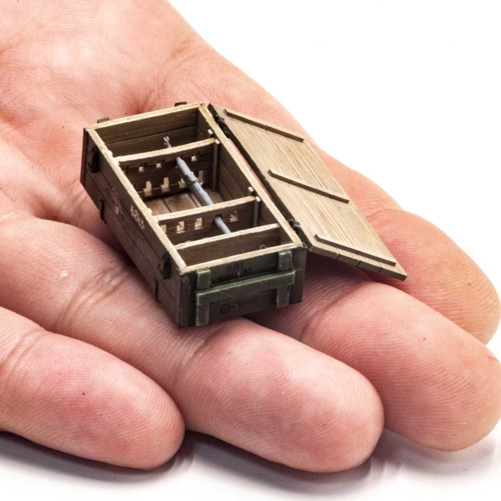 Набор включает в себя смоляные детали, плату фототравления с имитацией замков, петель и обивки ящика, а так же декаль с характерной маркировкой