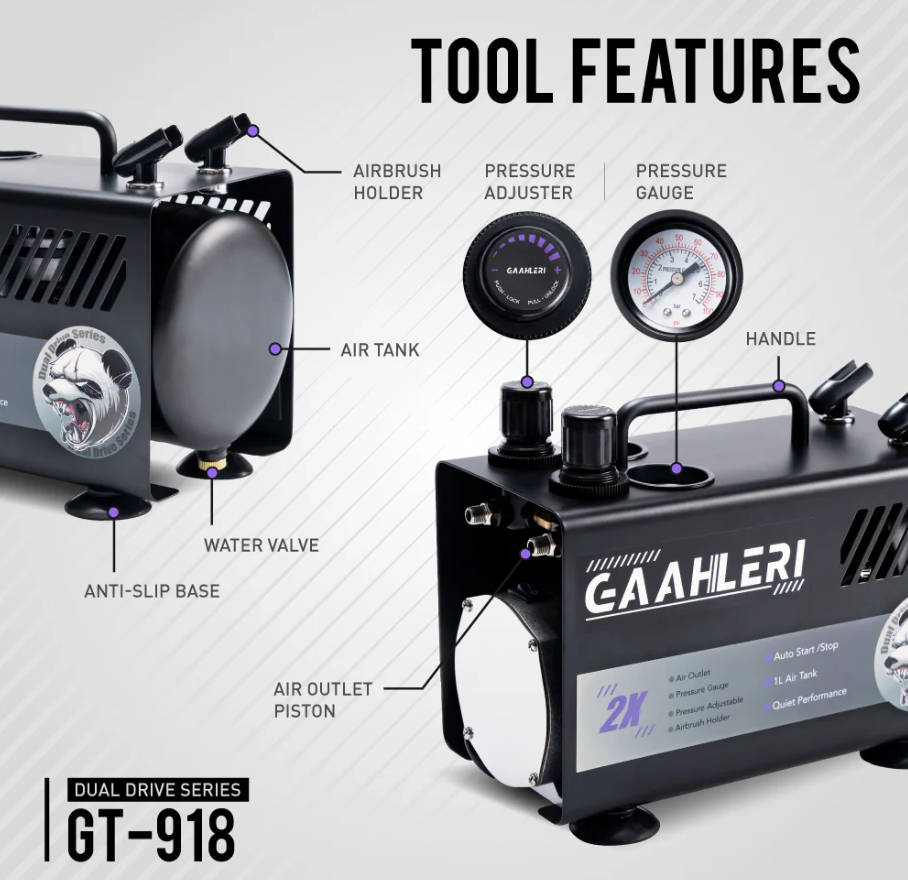 Благодаря своим передовым функциям, компрессор Gaahleri Dual Drive Series Airbrush Kit Compressor GT-918 предлагает непревзойденную универсальность, устойчивость и простоту использования, что делает его идеальным выбором для всех ваших потребностей в аэрографии.