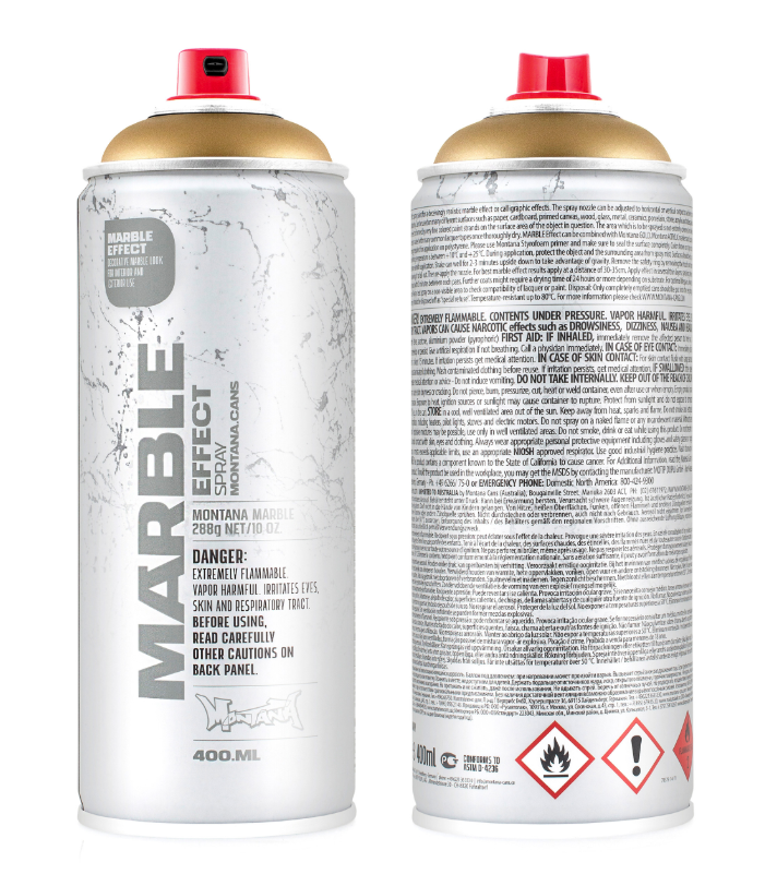 Montana краска мрамор-эффект - декоративная отделочная аэрозольная краска. Благодаря специальному составу создает по фактуре и цвету эффект мраморной поверхности. Краска может наноситься на различные материалы, такие как: дерево, бумага, картон, холст, стекло, металл, керамика, фарфор, камень. Устойчивость краски к внешним воздействиям увеличивается при покрытии слоем бесцветного лака.