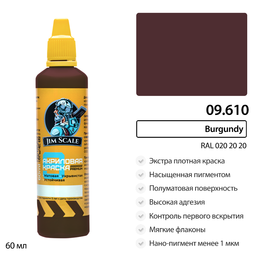 Краска акриловая универсальная Jim Scale 09.610 цвет Burgundy (RAL 020 20 20), 60 мл