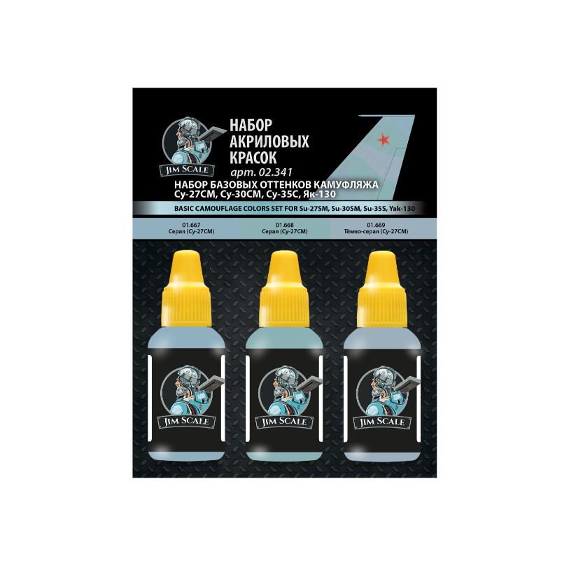Набор красок Jim Scale 02.341 Базовые оттенки камуфляжа Су-27СМ, Су-30M, Су-35С, Як-130, 3 шт.