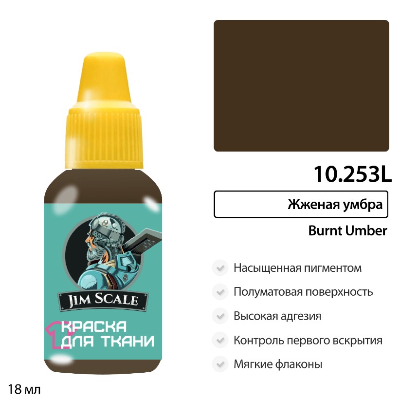 Вопросы и ответы по товару Краска акриловая Jim Scale 10.253L для ткани, цвет Жженая умбра (Burnt umber), 18 мл