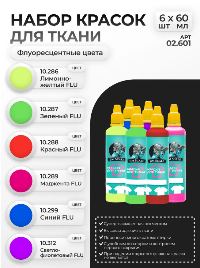 Набор красок по ткани Jim Scale 02.601 ”Флуоресцентные цвета”