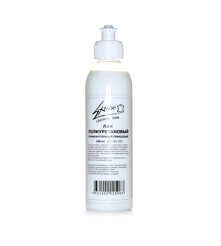 Высокопрочный полиуретановый, глянцевый водный лак для кожи. В отличии от финишных лаков (LCC-01 и LCC-02) не содержит водо-грязеотталкивающих добавок в своем составе.