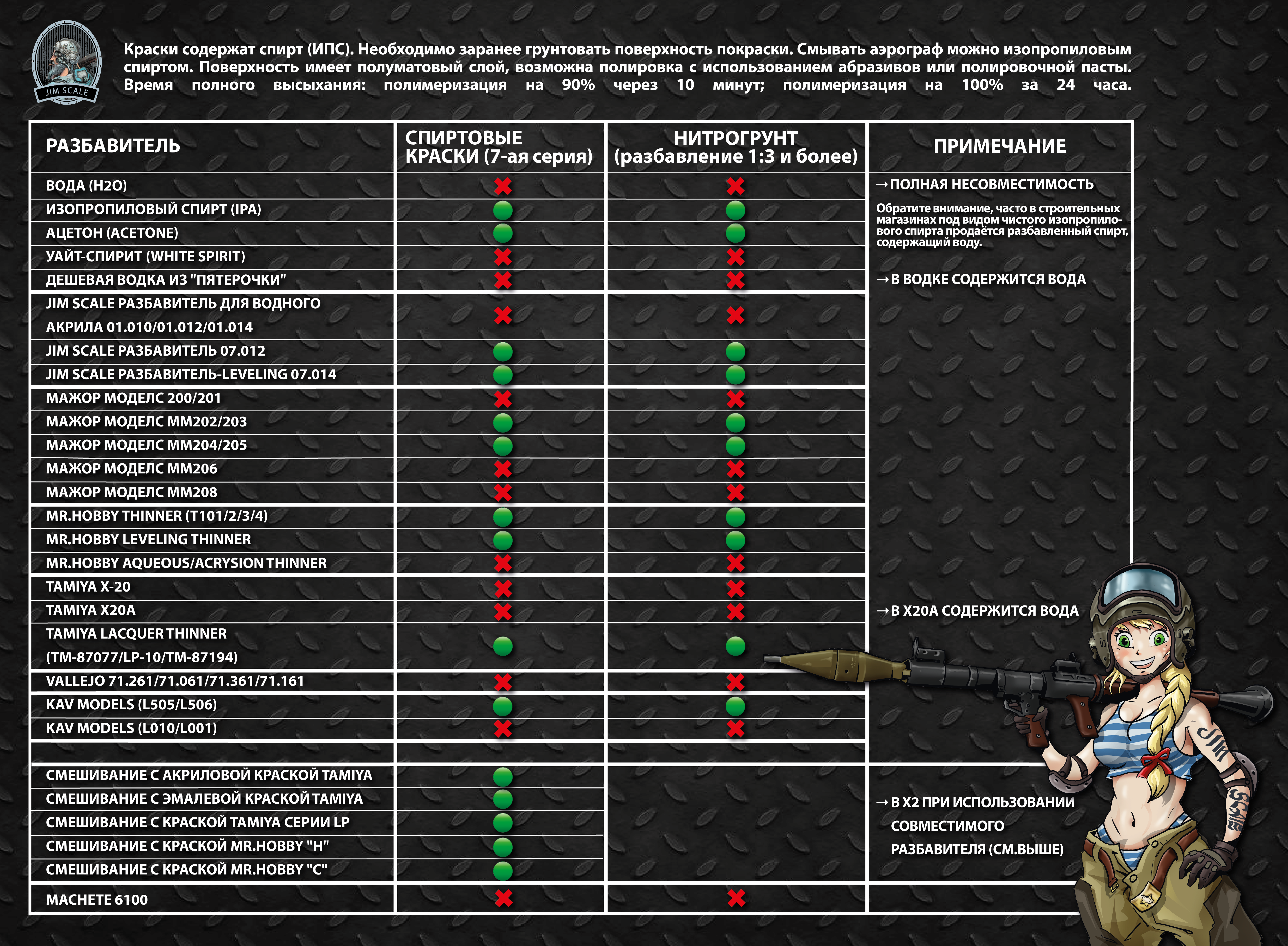 Лак густой и требует разведения при работе с аэрографом в комфортной для работы пропорции (1:1, 2:1 и т.д.); при этом пропорция разбавления не влияет на адгезию и прочность пленки лака.
