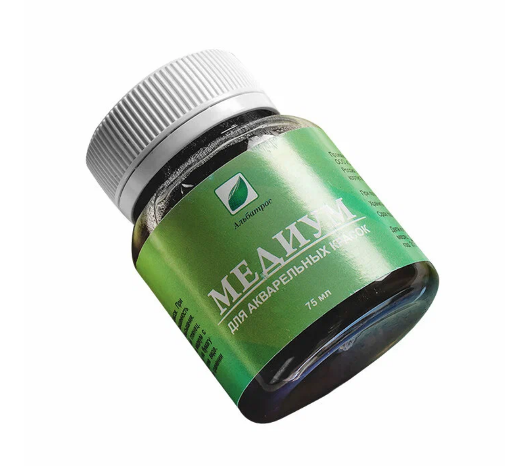В составе вода, гуммиарабик и глицерин. Идеально подойдет для разведения акварели. С медиумом возрастает цветовая насыщенность и разносимость краски, увеличивается скорость высыхания. Также после высыхания появляется приятный небольшой блеск. Можно смешивать сразу с краской на палитре, а можно нанести на бумагу.