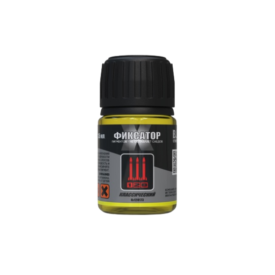 Фиксатор пигмента классический – новый состав для фиксации пигментов на основе уайт-спирита, не оставляет следов. Фиксатор поставляется в таре 35 мл с черной крышкой. Крышка оснащена мягким уплотнителем. Этикетка не вступает в реакцию с летучими растворителями и уайт-спиритом.