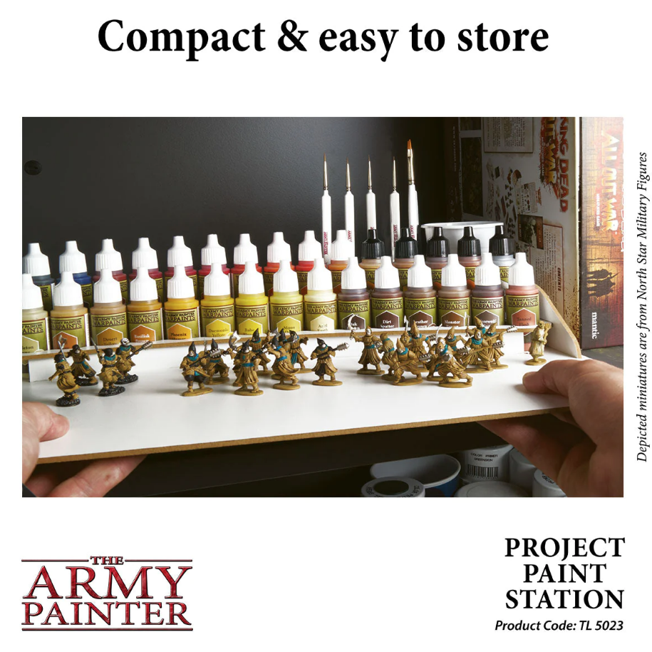 Project Paint Station от компании Army Painter - это удобный аксессуар, призванный помочь моделисту в его нелегком деле. Project Paint Station легко чистится от краски и не боится пролитого клея, так что его можно использовать для ваших самых смелых проектов. Всего Project Paint Station имеет 30 слотов под краску, слот для стакана с водой и несколько специальных держателей для кистей.