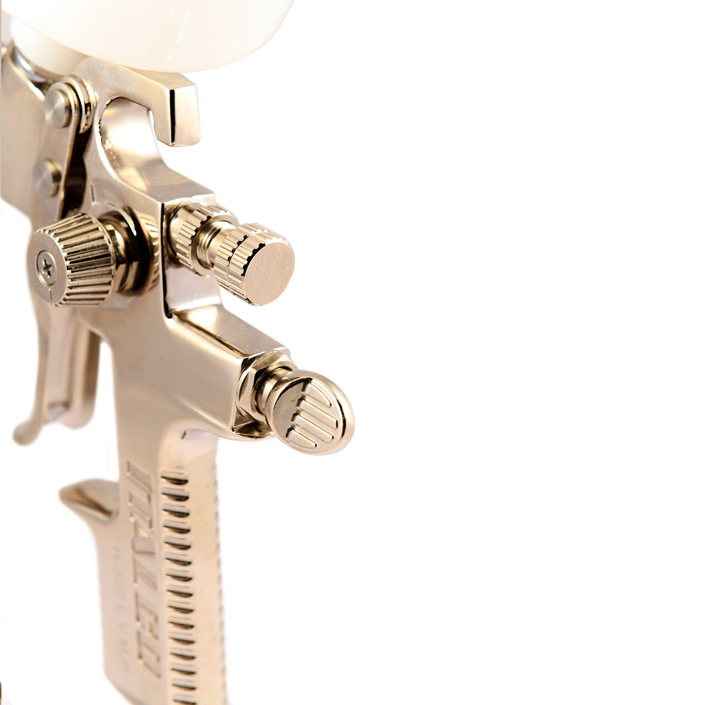 Возможность регулировки подачи воздуха, рабочего материала и формы факела (до 20 см). Коэффициент переноса краски -  более 65%.