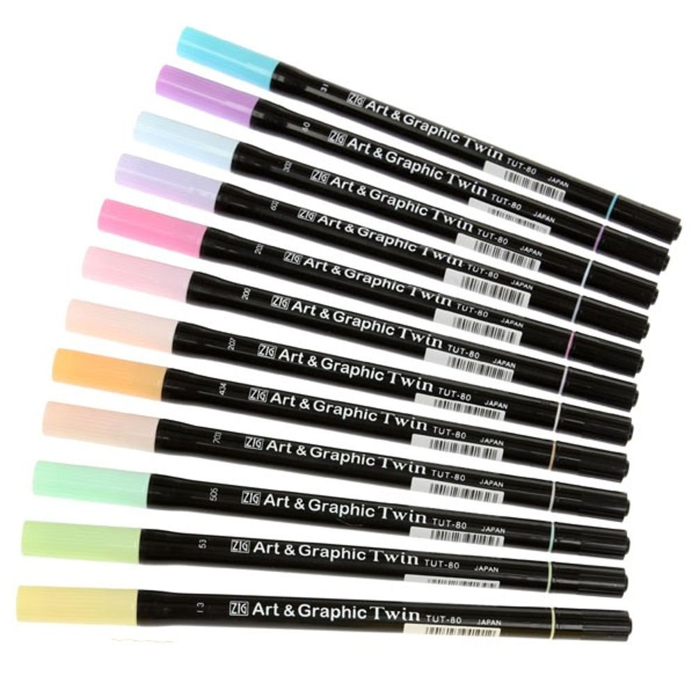 Представлены в 80 ярких цветах и бесцветным двухсторонним блендером. Имеют тонкий наконечник 0,8 мм для тонкой детализированной работы и гибкий резиновый наконечник для больших применений. Art & Graphic Twin - это краситель на водной основе, наиболее подходит для бумаги.