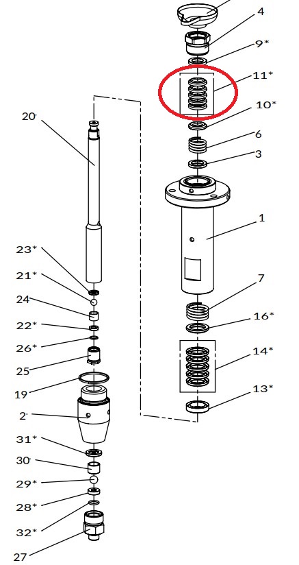 Используется в насосах с коэффициентом усиления 32:1, применяемых для безвоздушного (Airless) и комбинированного (Multi-Spray) распыления в мебельной и металлообрабатывающей промышленности.